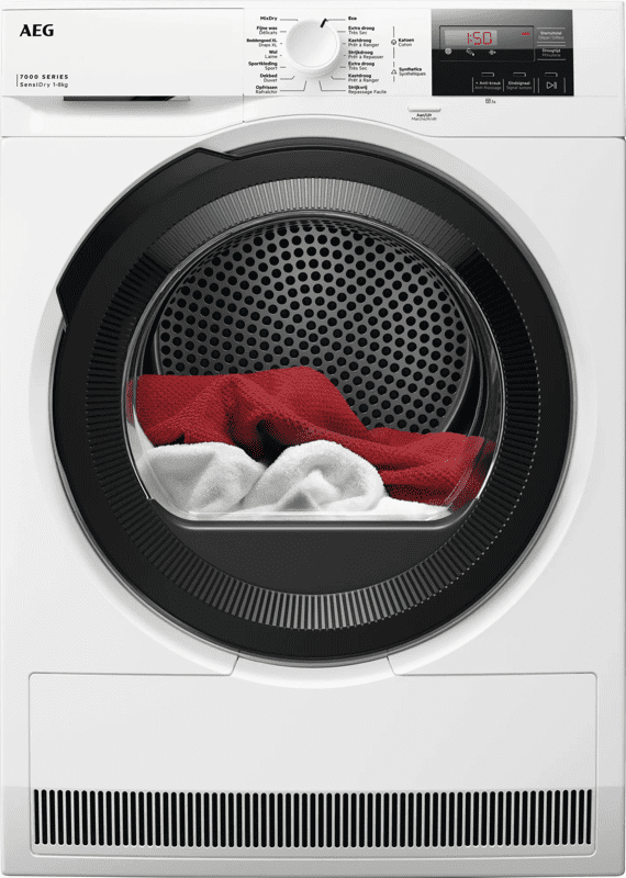 Je droogt kleine en middelgrote ladingen wasgoed in de AEG TR72CWZ84 droger. Met 8 kilogram vulgewicht heb je ruimte voor het beddengoed van één tweepersoonsbed of een aantal outfits. Heb je maar een kleine lading was? De ProSense beladingssensor past het programma automatisch aan op iedere hoeveelheid. Zo droog je nooit te lang. Dankzij SensiDry droogt de warmtepompdroger op een lagere temperatuur. Hierdoor slijt en krimpt je kleding minder snel en blijft je favoriete outfit langer mooi. Je kiest uit 1 van de 14 verschillende droogprogramma's. Heb je geen zin om kleding te sorteren? Kies dan voor het MixDry droogprogramma.rnrn<p><strong><small>Bij deze wasdroger zit geen afvoerslang. Koop deze er apart bij om de droger op de waterafvoer aan te sluiten.</small></strong></p>rn