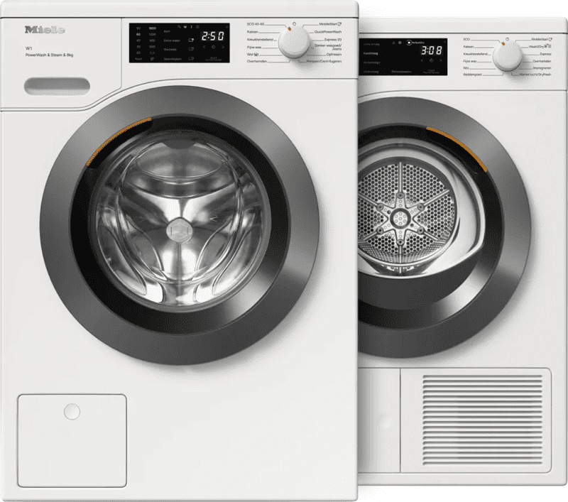 <p>Met de Miele WEC 388 WCS PowerWash & Steam + Miele TEC 648 WP EcoSpeed & Wash2Dry wasmachine en droger set doe je je was energiezuinig en verminder je strijkwerk.</p>rnrn<p><strong>Wasmachine</strong><br>rnMet 8 kilogram vulgewicht heb je ruimte voor kleine en middelgrote ladingen was. Denk bijvoorbeeld aan het beddengoed van één tweepersoonsbed. Je wast extra snel dankzij PowerWash. Met het QuickPowerWash programma was je een halfvolle trommel in maar 49 minuten. Met het SteamCare stoomprogramma fris je je muffe shirt op zonder wasbeurt en verminder je kreukels. Dat scheelt jou tijd en strijkwerk.</p>rnrn<p><strong>Droger</strong><br>rnMet Wash2Dry koppel je je wasdroger via je smartphone aan je Miele wasmachine. Met dit programma past de droger automatisch de instellingen aan op het laatste wasprogramma. Zo gebruik je altijd het beste droogprogramma voor je was en blijft het langer mooi. Met EcoSpeed droog je snel en zuinig een volle trommel. Je beddengoed is na ongeveer 3 uur droog, wat sneller is dan de gemiddelde droger met 8 kilogram vulgewicht.</p>rn