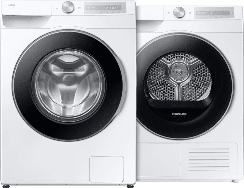 <p>Met de Samsung WW90DG6U25LH Super Speed + Samsung DV90DG6845LHU3 AI Dry+ was en droog je zuinig 9 kilogram wasgoed.</p>rn<p><strong>Wasmachine</strong><br>rnJe hebt met 9 kilogram vulgewicht genoeg ruimte voor de kleding van een hele week. Met Super Speed was je een halfvolle trommel in 39 minuten. Voor een extra schone was zet je Steam Wash aan. Hiermee verwijder je bacteriën met stoom.</p>rn<p><strong>Droger</strong><br>rnAI Dry+ herkent de stof van je was en past daar het droogprogramma op aan. Zo blijft je sportbroek of favoriete trui langer mooi. Met 9 kilogram vulgewicht droog je al je was in één keer. Koppel de droger via SmartThings aan je telefoon, download extra programma¿s en start het droogprogramma ook op afstand.</p>rn