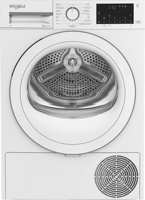 Je droogt kleine en grotere ladingen stil in de Whirlpool C WD 84M WWS BE. Je hebt met 8 kilogram vulgewicht ruimte voor kleding van meerdere dagen. Wil je snel naar de sportschool? Kies dan het snelle programma, waarmee je in 30 minuten een paar shirts droogt. De 6th Sense technologie zorgt dat je wasgoed nooit te lang droogt. De vochtigheidssensoren meten precies hoeveel vocht er in je wasgoed zit en passen daar automatisch de programmaduur op aan. Zo bespaar je op tijd en energie. Dankzij energieklasse C droog je het wasgoed energiezuinig. Je bespaart door de lage droogtemperatuur tot wel € 200,- aan energiekosten over de levensduur.